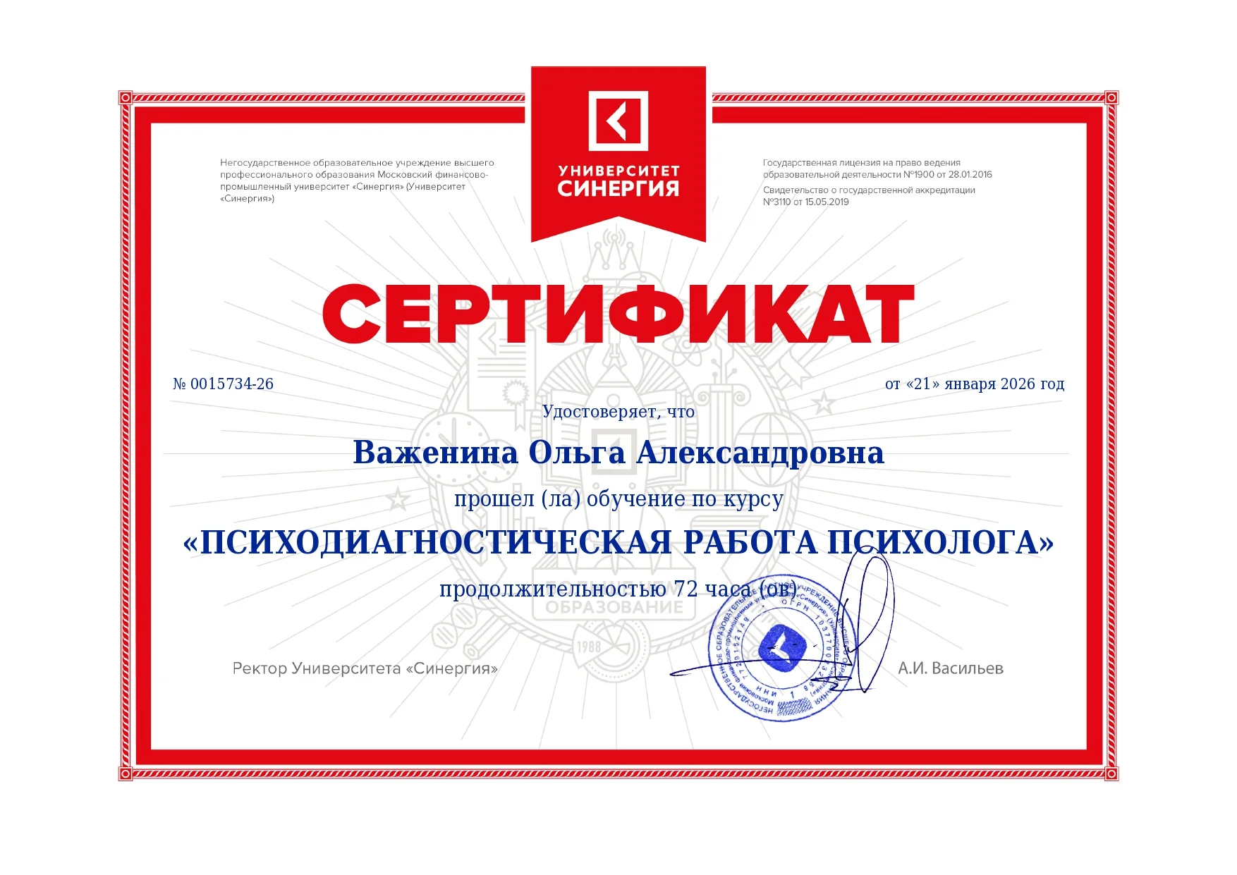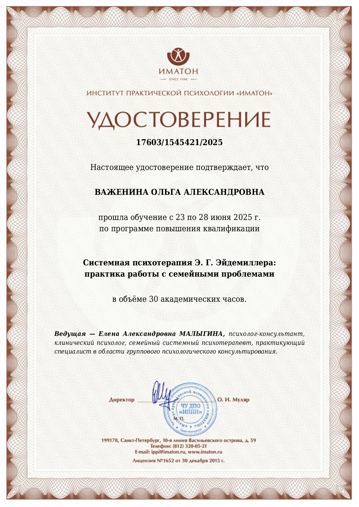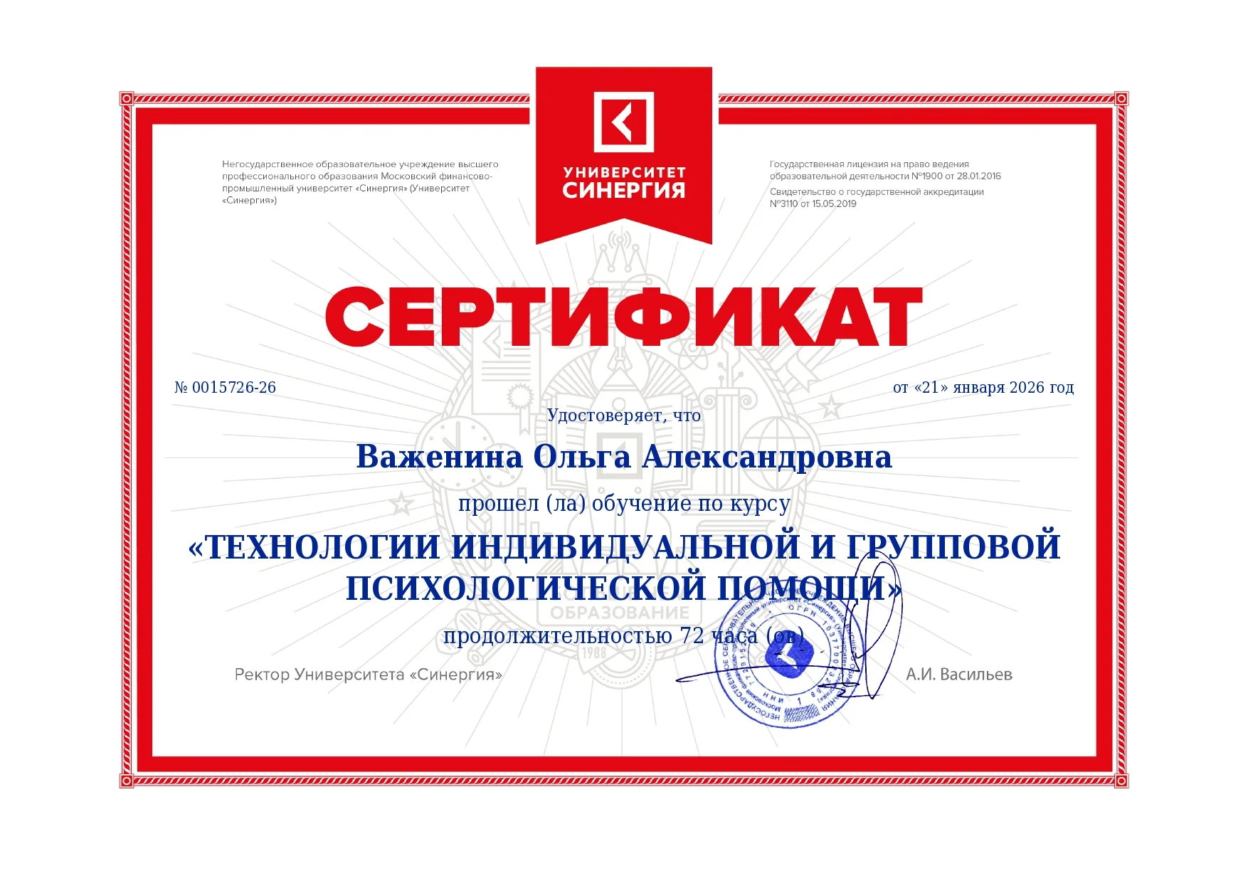 Я, Ольга Важенина — практикующий семейный психолог с высшим медицинским и психологическим образованием, действительный член Общероссийской профессиональной психотерапевтической лиги. Моя главная задача — создать для вас безопасное и доверительное пространство, где можно быть собой, без страха осуждения.
